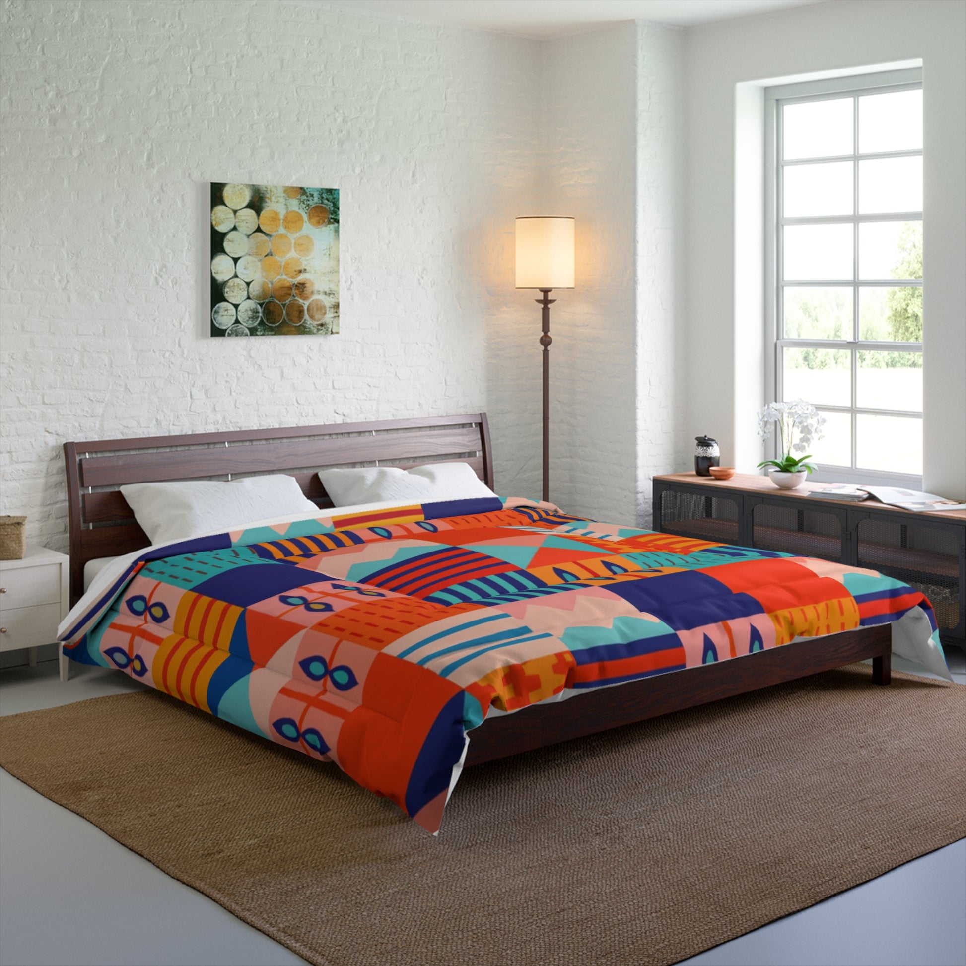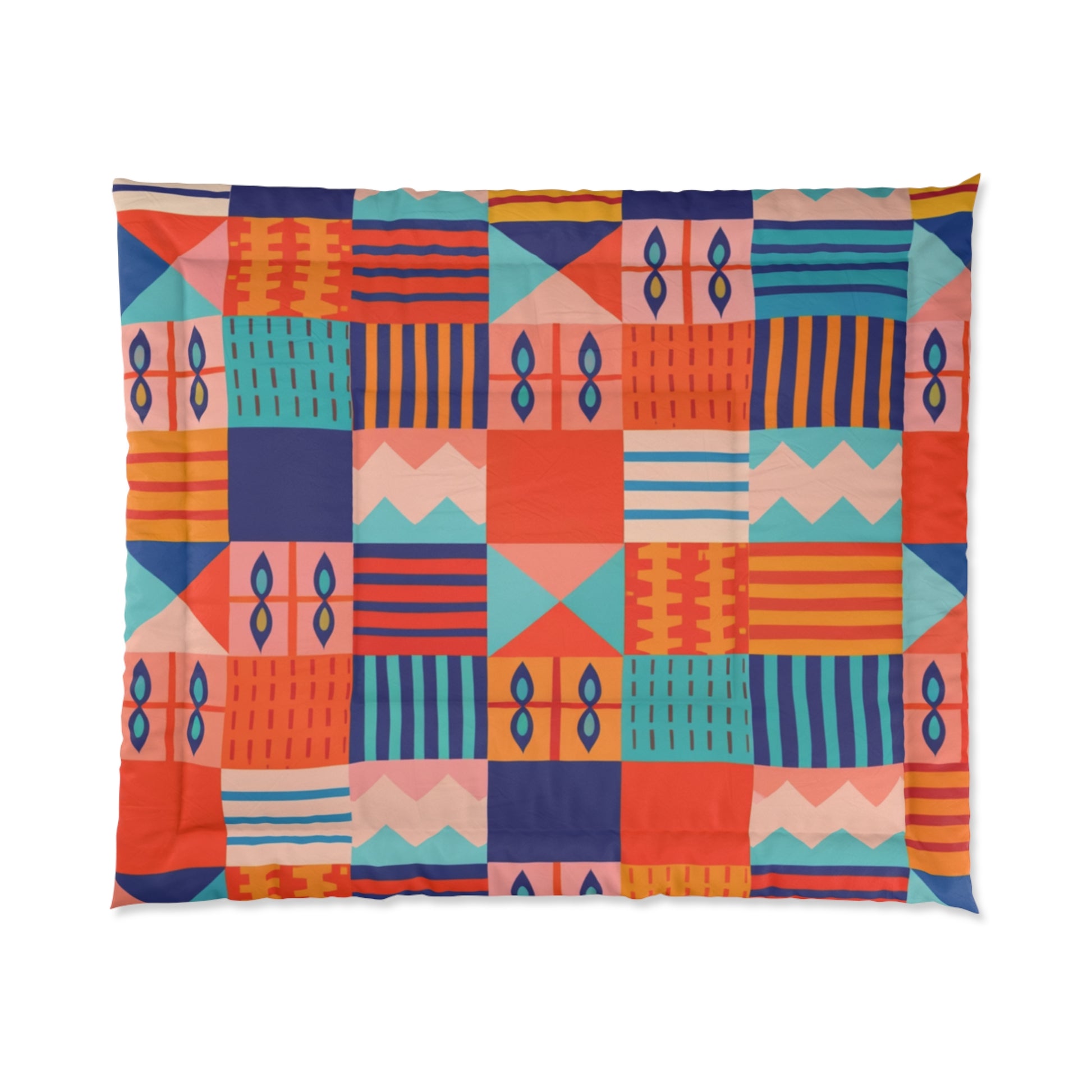 Bright, geometric, and quietly bold — this comforter brings playful pattern and soft warmth to rooms that crave personality. The double-square quilting holds the plush batting in place so the surface stays cozy and even night after night. Colors pop in teal, lemon, and violet blocks that sit against a clean white reverse, adding an artful layer to minimalist bedrooms or eclectic spaces. Throw it over the bed for an instant mood lift, or fold it at the foot of a couch for an unexpected splash of color. It feels smooth against the skin and light enough to layer, yet substantial where it counts — a go-to textile for anyone who loves pattern-forward decor with a comfortable, lived-in feel.